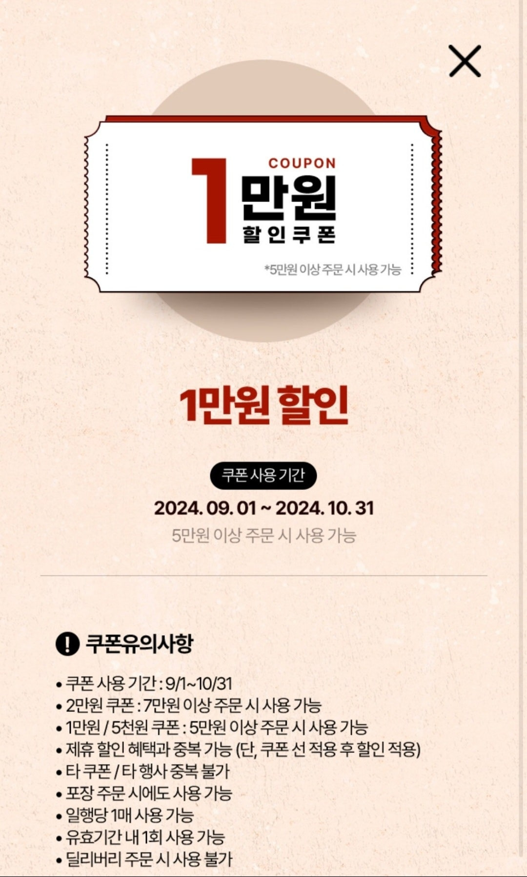 - 5만원 이상 결제 시 1만원 할인